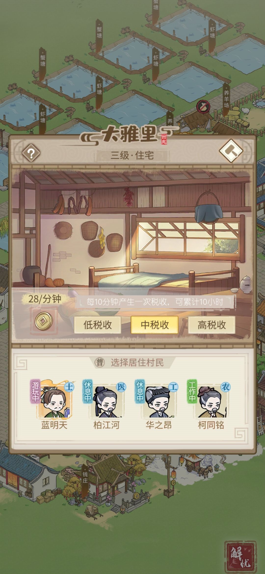 新手入坑一周,最期待的是攒元子开荒,砍…拔…埋…太解压啦[表情_比心] 先来分享一下新手对解忧小村落这款种田小游戏的心得和攻略 首先 1、游戏画面:画面配色清新,看着很舒服。 2、玩法简单:前期:开荒,种树,屯材料,盖房,给村里引进人才,分配村民去对应属性的地块干活。 前期建设攻略分享: ①前期开荒:集市采买斧子和榔头砍树敲山开荒,少量铁铲,用来填埋水坑。注意前期要想富先种树。后面很多建筑建设升级