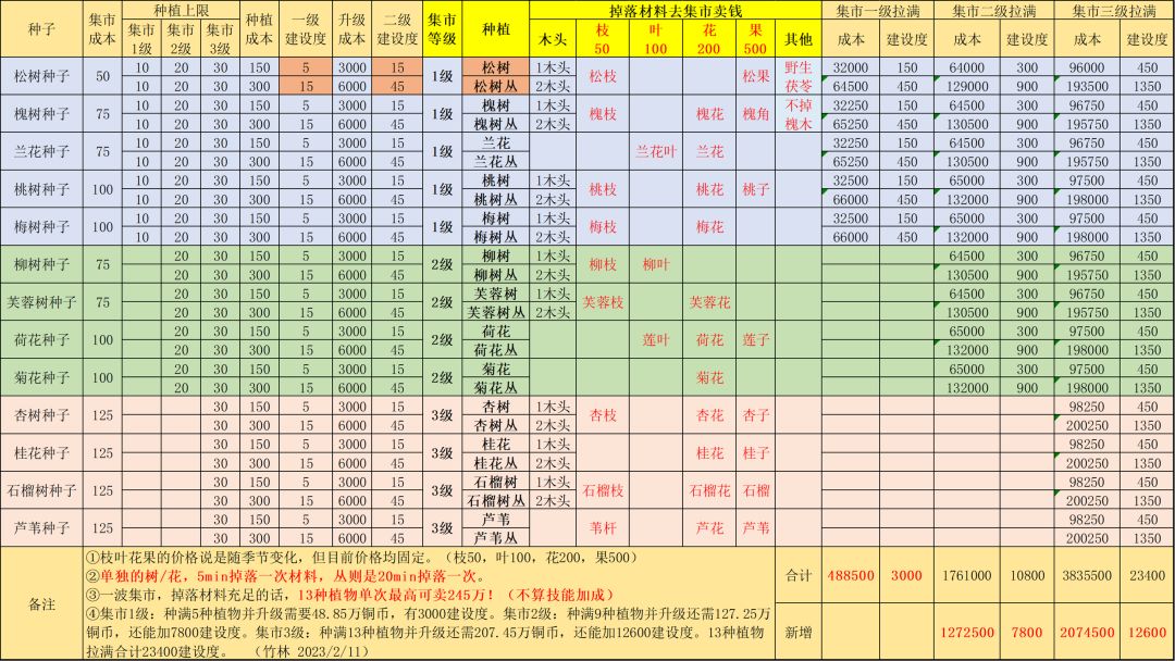 要想富,先种树! 为啥解忧小村落,别名种树小村落? 都说卖树挣钱,卖树到底有多挣钱? 下面贴主用具体的数据来让大家感受下,卖树是有多省事,还多挣钱! 废话不多说,还是先上表格,懒人可以直接看结论。 说明1: 开局1级集市,可种5种植物(松、槐、兰、桃、梅),官府11级解锁2级集市,解锁4种植物(柳、芙蓉、荷、菊),官府23级解锁3级集市,解锁4种植物(杏、桂、石榴、芦苇)。同样的,11级和23级也