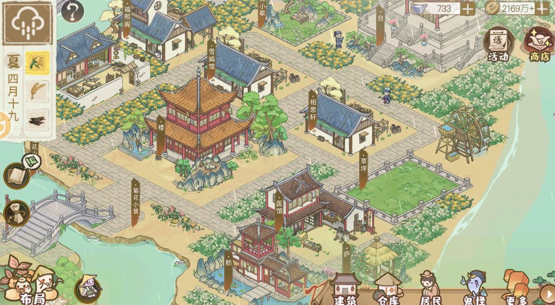 7.制造建筑按需建,千万别建多(血的教训) 8.医馆药铺商行前期没钱不用建,没必要跟着主线走。 9.琴棋书画没有到上限前不要升级,升级没用。 10.婢女护院管家都要先入住,才能派遣到商宅。 11.石头为矿场采得矿石,在冶炼厂合成获得(也可直接购买,很便宜,缺的时间很建议买),木头为种树获得,梨花木和银杏木(缺直接买就行了),花岗岩和大理石(花岗岩每天买满不亏,大理石应该不会缺) 以上购买均在商店中