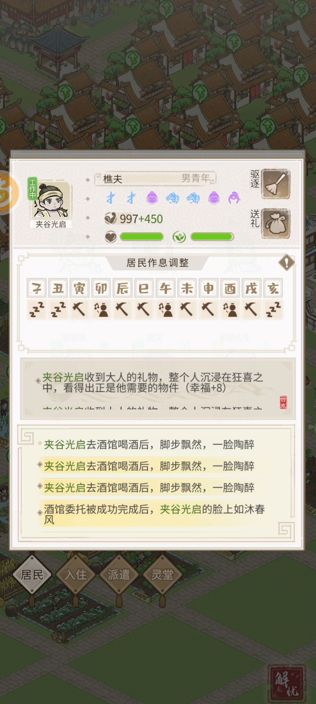 贴主前几天已经发了这个的全部了,后来发现实在有点太长,而且包括东西太多,怕萌新没耐心看完,所以特地分了篇章。好了废话不多说,下面是内容。 1.重点,居民生病了这么办,不用管让他继续工作,等他健康值调到五百以下会自己去医馆看病。 PS: 别送白芷散及其他药物会降健康值!!! 要想把病治好,要给居民送解热散,据说要送五六个,目前失眠来看是绝症,贴主现在能造几百个解热散,但是这要浪费每天为数不多的送礼