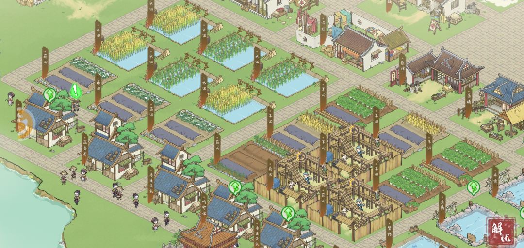 一些布局分享 1...我将在不同地块工作的居民进行了分类,方便后续寻找和更换,并且可能会对幸福值有影响,之前看的帖子说离工作地点近比较好。 2...例如虽然都是农民,但是我将渔夫和种田农夫分开居住,就很方便进行更替,只要去固定地块寻找就好了。 3...最后一张是专门收高税的居民,在每个居民区都放置游览建筑,方便赚钱。 4...由于养蚕厂并不需要人工就将它随便扔在哪里都可以。 5...采药区之前可以拔掉,但是不要放东西,我放了一堆树,直接被顶没了,背包里也没有。
