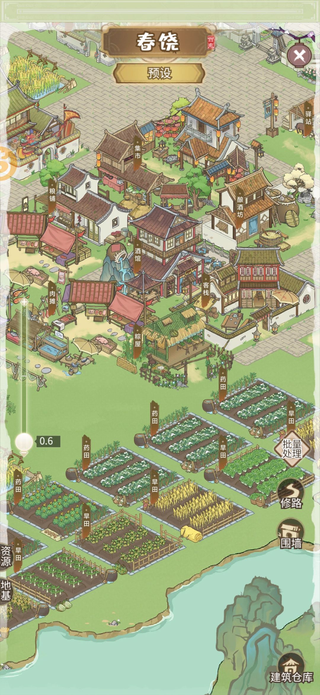 不对称布局。 话不多说直接上图,编辑好几次都失败了,给我恶心坏了。 地基图: 把驿站跟商行放这里,代表这条小路通往外界,外面的人从这条小路进来,在驿站修整,我们的商队从这条小路出发,去往外界。 此处设有酒楼,供旅人休憩~ 有闲情逸致可以上高台,纵览全村(假装这里是全村最高的岛)~ 这里上次是做的书生小院,这次改了个商人小院,布局总是有无限可能的。 全局 总人口300人,水产、种植拉满,畜牧鸡、马2