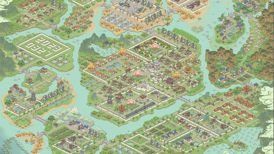 杳渺山(肉摊鱼摊矿场冶炼厂鸡场) 云鹿岭(虾塘鱼塘蟹塘) 隐峰岚(矿场) 泗水滨(水田旱田药田) 浮烟谷(猪场马场) 烟景坡(矿场与住宅区) 春饶(主城) 还有三个小岛没有布局完成,因为刚到23比较缺资源 房子与道路,房子与房子,房子与文化建筑之间,都可以尝试去穿插树,既能提高建设值,又美观