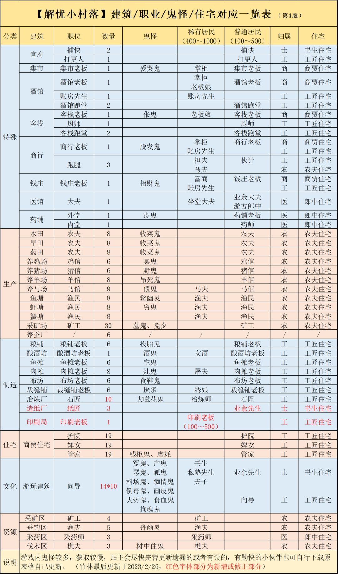 2023/2/26更新完善:将居民职业对照表更新了第4版,冶炼厂数量更正为10个,并且新增了造纸厂和印刷局。