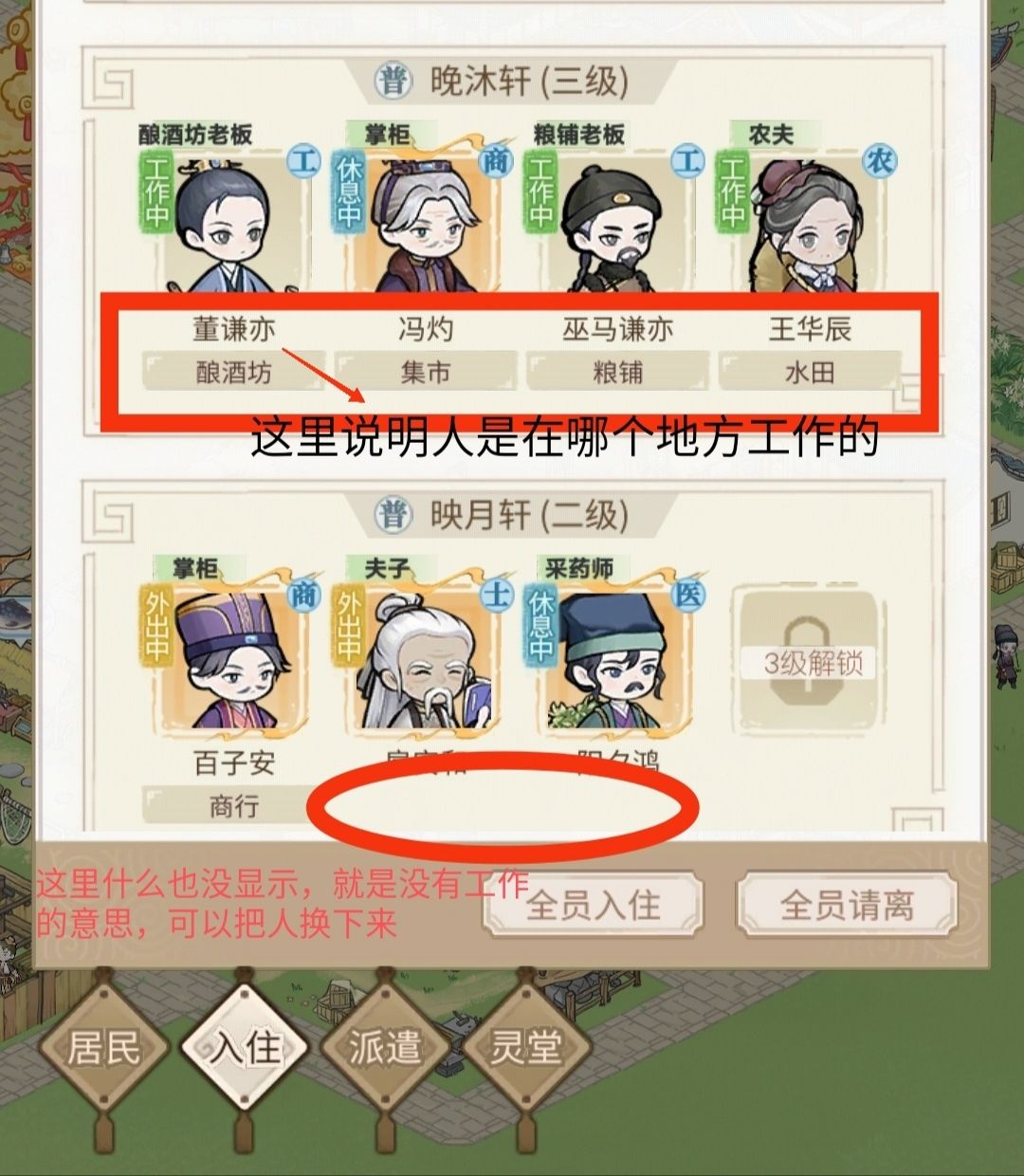 前期遇到旷工一定要买!!!! 不然像我玩了三天一直刷才刷到两个 遇到采药师也一起买了吧! (更新之后概率好像改了,不过备着也挺好) 招人的地方有三个,驿站,客栈,官府 1.驿站:30min刷新一个人,可以使用招募券刷新 2.客栈:点击客栈,有时候会有感叹号的小人,点击他给钱,不过只能招到马夫,女酒,老板娘(客栈招的人要比驿站便宜一点) 3.官府:点击师爷探访人才,15min一次,携带不同物品增加不
