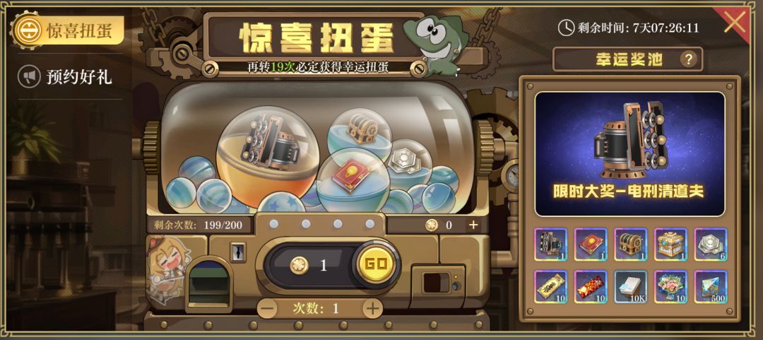 限时大奖——电刑清道夫一览 ■活动时间: 2023年1月16日-1月25日 ■开启条件: 区服开启时间大于25天的服务器 ■规则说明: 1. 幸运扭蛋可以随机开出幸运奖池中的随机一个奖励,奖励不会重复获取。 2. 当连续19次没有抽中幸运扭蛋时,下次扭蛋必定获得幸运扭蛋。 3. 幸运奖池被全抽取后无法再获得幸运扭蛋。 4. 每期活动最多抽取200次,多余的扭蛋币可以等待下次扭蛋活动开启时使用。