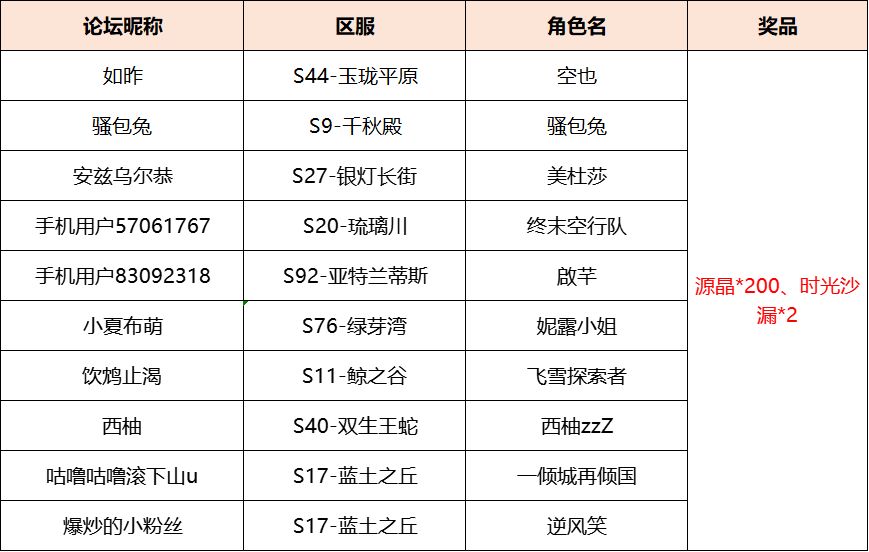 感谢各位开拓者的积极参与,接下来公布中奖名单,快来看看有没有你鸭~ 【获奖名单公示】 温馨小提示:奖励将在公布获奖名单的7个工作日内发放,请开拓者们注意查收~ ======分割线====== 挣脱枷锁,冲破禁锢!新的冒险已经开始~ 相信开拓们已经拿到通缉令,前往舒弗瑞兹小镇开启新征途了.... 为了更好的为开拓者们建设精彩有趣的赛特瑟尔世界, 道尔顿诚挚地邀请您说出关于本次[离解枷锁]活动的感受或