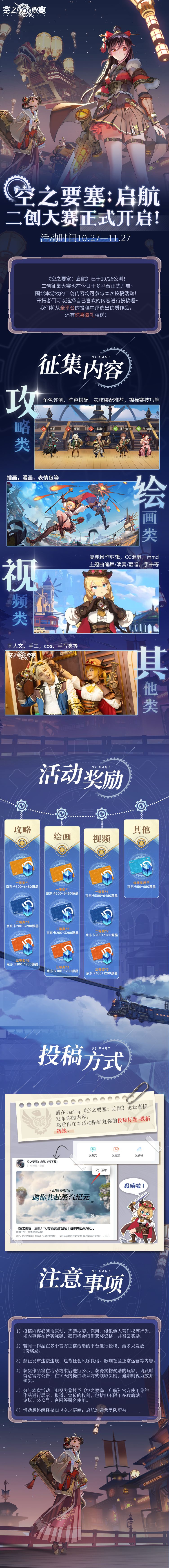 《空之要塞:启航》已火热启航! 二创征集大赛也在今日于多平台同步开启,围绕本游戏的二创内容均可参与本次投稿活动! 开拓者们可以选择自己喜欢的内容进行投稿。 我们将从全平台的投稿中评选出优质作品,还有惊喜豪礼相送,快来参与吧! 【活动时间】 2022年10月27日-2022年11月27日 【本平台参与方式】 ①围绕《空之要塞:启航》的二创内容均可参与 ②投稿类别为攻略类、绘画类、视频类以及其他类