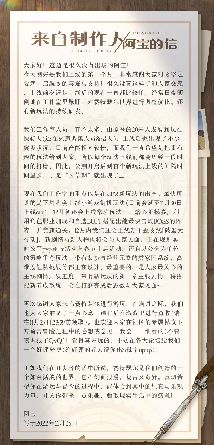 今天刚好是《空之要塞:启航》上线满一个月,感谢各位开拓者的喜爱与支持! 这边是制作人阿宝!好久没和大家这样聊天(我也好久没出现了哈哈),今天准备了一封信,和大家唠唠项目的情况。 欢迎大家在评论里留下您的冒险感想或意见!我都会一一阅读的。 还要记得在11月27日23:59前登录《空之要塞:启航》,领取我们的小小心意~