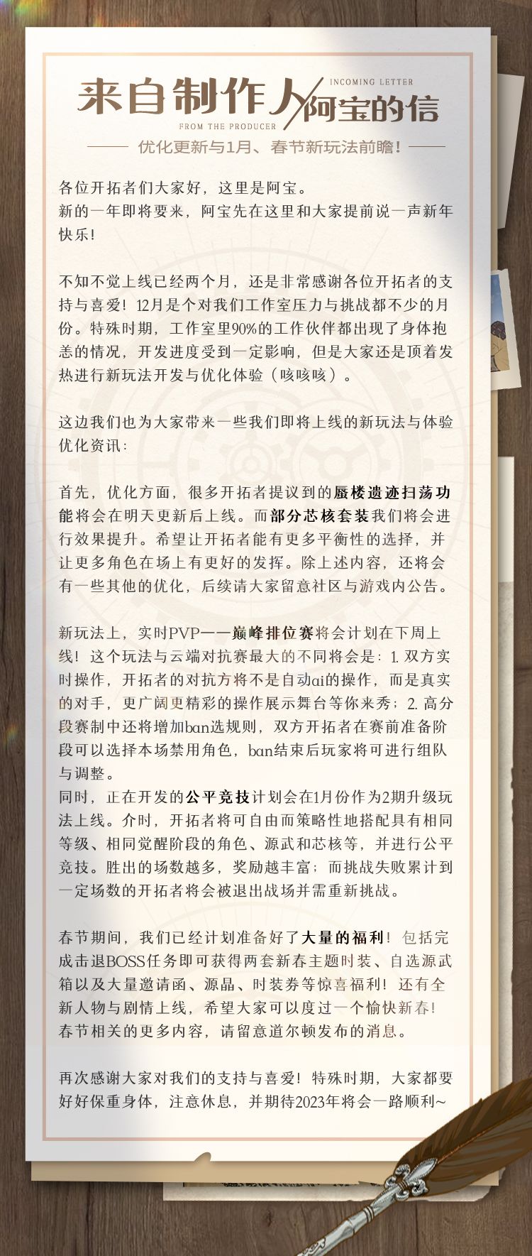 来自制作人阿宝的信 | 优化更新与1月、春节新玩法前瞻!