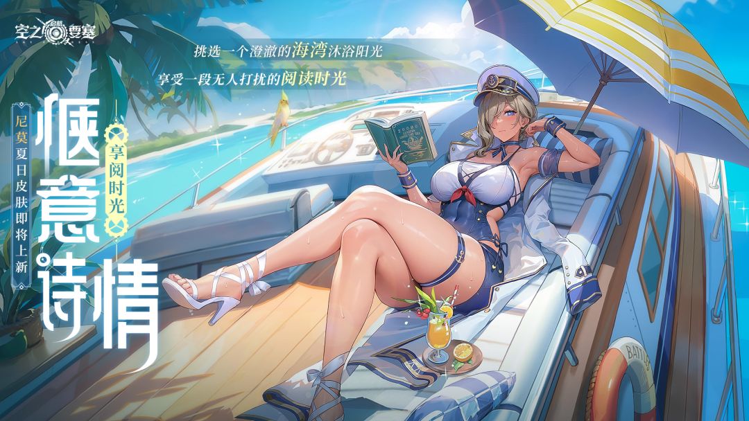 尼莫夏日泳装皮肤「享阅时光」即将上新! 「现在游泳有中暑的风险,还是喝杯果汁吧」 选一个澄澈的海湾沐浴阳光,享受一段无人打扰的阅读时光。