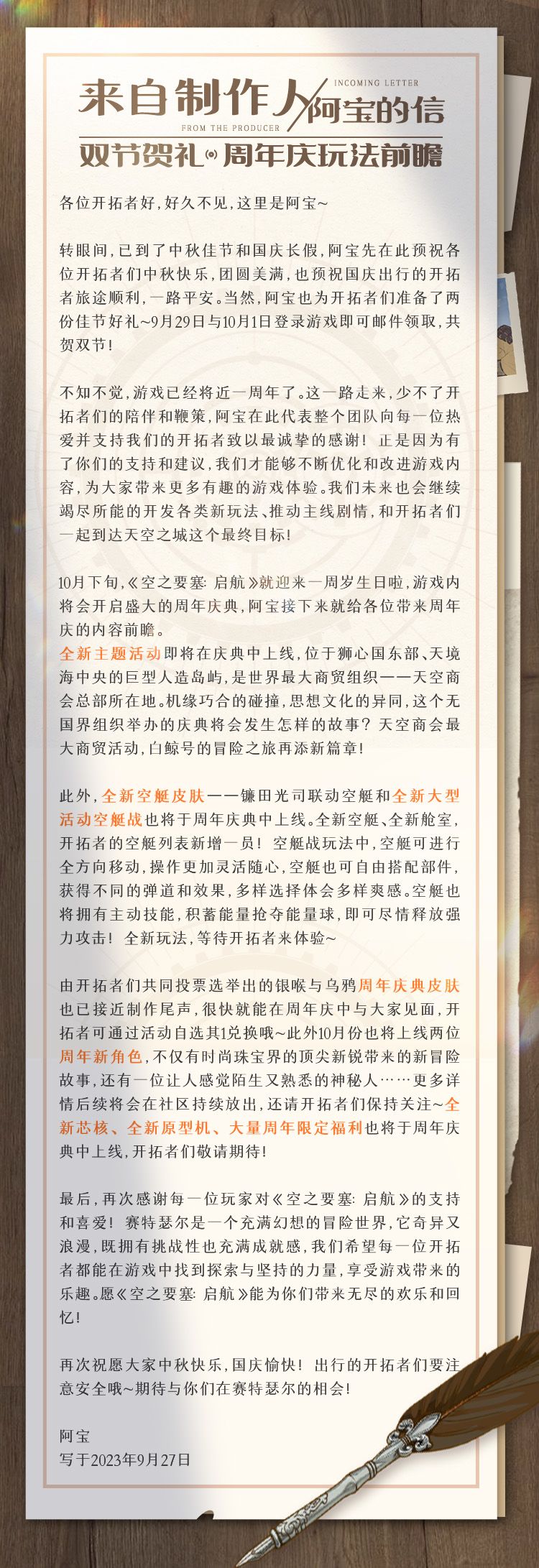 来自制作人阿宝的信 | 双节贺礼,周年庆玩法前瞻