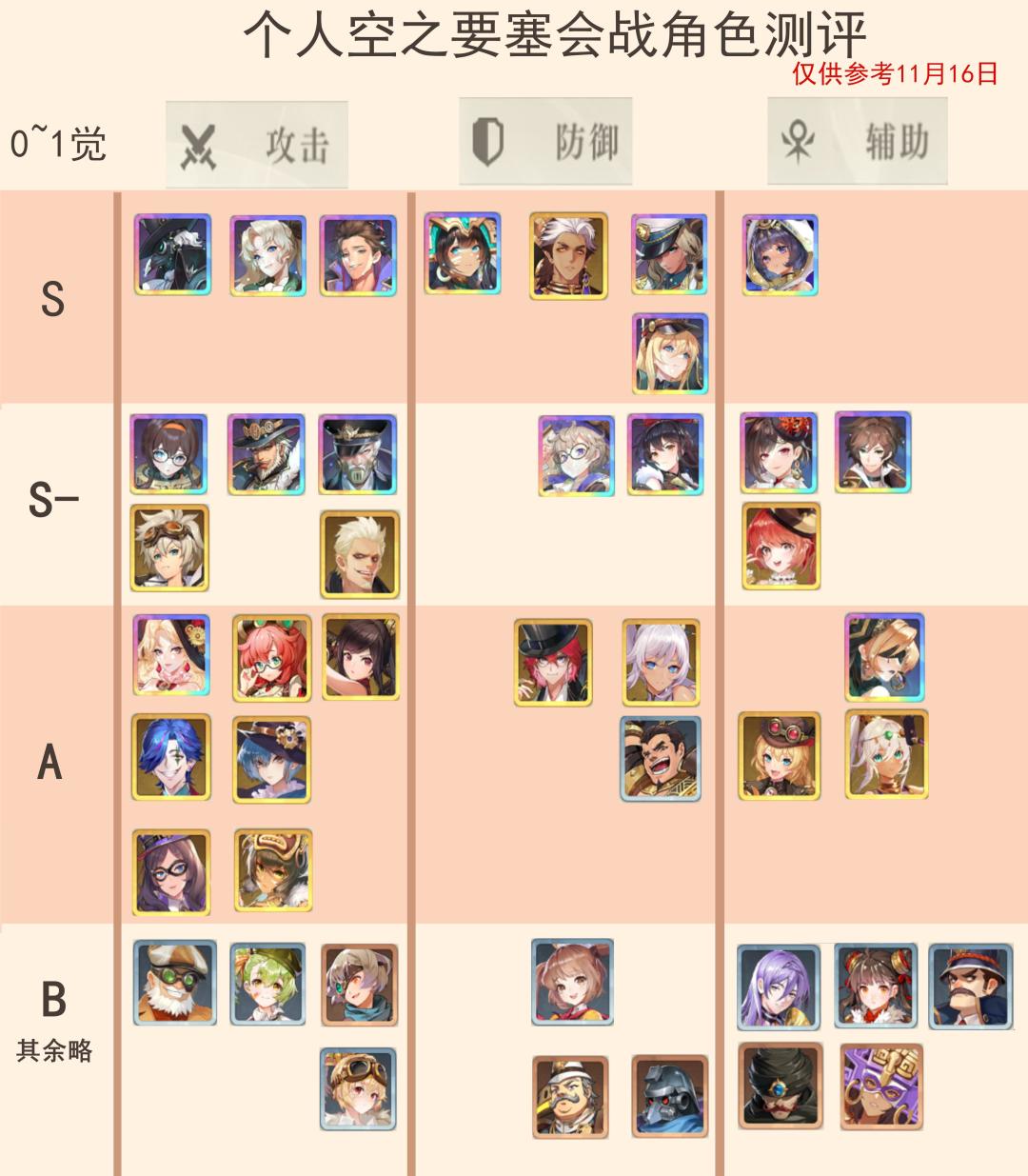 抛砖引玉 列一下个人排名 红大厨 t0 小太妹 魔术师 珠宝小富婆 养鱼小萝莉 t1 特务头子 占星师 引火女警长 女狙击手 t2 莲华大老板 玫瑰 t2.5 反差女 大明星 戳戳鸦 t3 裂缺崩 苹果 奶爸 t4 刀妹 老妖怪 拉拉妹 t5 安神 永远的安全带 稳坐倒数第一 防御角色我用的少除了魔术师其他暂时不计入排名