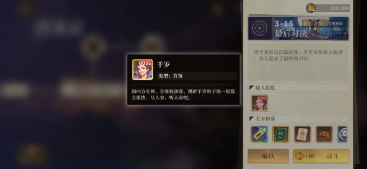 打败千岁前玩法的建议(无视请直接滑到4)1.新手建议(收菜档、土豪档请无视)如果你是一个萌新玩家,我建议可以在2-13花梨boss前先不抽卡,只把主角拉到14级来体验花梨关卡,这个配置是有难度的。温馨提醒:如果你打不过,可以考虑把翠西亚也拉到14级。如果还打不过?那么体验感肯定是极差的,建议可以退出游戏进行卸载了,否则后面越氪越自卑。因为3-15的难度是大于这种难度的,并且3-15之后