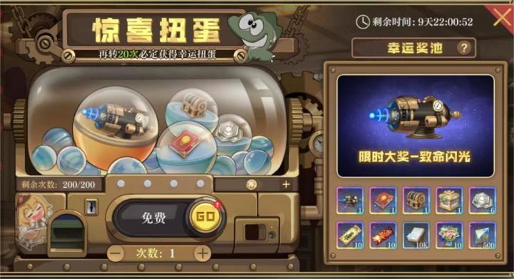 ■活动时间:2023年2月26日-3月7日■开启条件:区服开启时间大于25天的服务器■规则说明:1. 幸运扭蛋可以随机开出幸运奖池中的随机一个奖励,奖励不会重复获取。2. 当连续19次没有抽中幸运扭蛋时,下次扭蛋必定获得幸运扭蛋。3. 幸运奖池被全抽取后无法再获得幸运扭蛋。4. 每期活动最多抽取200次,多余的扭蛋币可以等待下次扭蛋活动开启时使用。