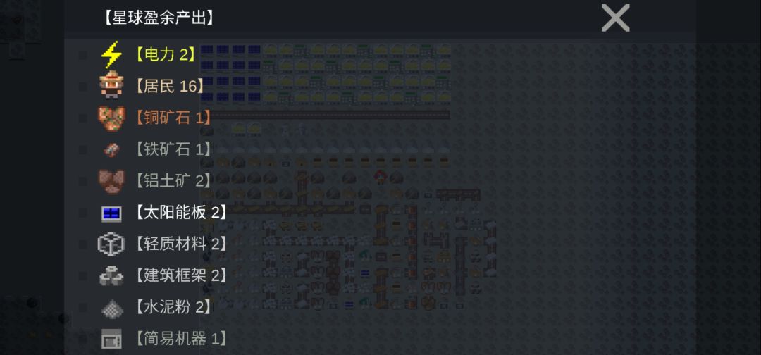 【游戏主线】 攀科技,直到解锁火箭修理 【生存限制】 无 【游戏思路】 人力物力控制在刚好能攀下一个科技 不多线并行,不追求批量化,人不够就加 科技升级后,不必拆旧建筑 【模组设计思路】 电力最优=太阳能发电=30电/格 农业最优=谷物温室=12/1.1=10.91粮/格 住房最优=1摩天大楼+3谷物温室=12/4.3=2.79人/格 ∵港口运输=2格+2人口=2.72格 ∴不连新建筑,道路≥3格