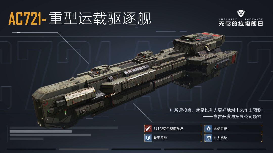◇开拓者舰船推荐 尊敬的开拓者: 无论是探索未知星域,寻秘遗迹,亦或是周旋于星际势力之间,奔袭在浩瀚银河之中,都少不了各类舰船的身影。因此,受仲裁委员会与安东尼奥斯财团的委托,拉格朗日频道特地为开拓者们准备了一批推荐舰船的资料,以帮助开拓者们更快的了解各类舰船的定位和作用。 本次为您介绍的是AC721—重型运载驱逐舰。 □AC721—重型运载驱逐舰 仲裁者委员会成立初期,将主要精力放在了太阳系复兴