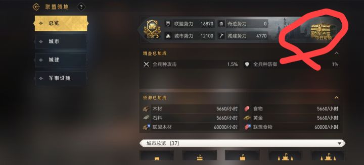 本篇是写给即将入坑或者已经加入到重返帝国大家庭的新手玩家的。以下是本人这几次测试的一些经验(走了不少弯路)希望给新手玩家带来一些帮助。基础很多其他的就不说了,已经有其他攻略团玩家发布建议去看看我们只讲干货 。1、资源:前期粮食够用不需要打粮食地,因此多打一些木材、石材、黄金这几个地。加入联盟后,可以在联盟里每天免费领取资源(如图所示)每天的行动令一定要买满(行东令如图,上限买三次)每天的掠夺