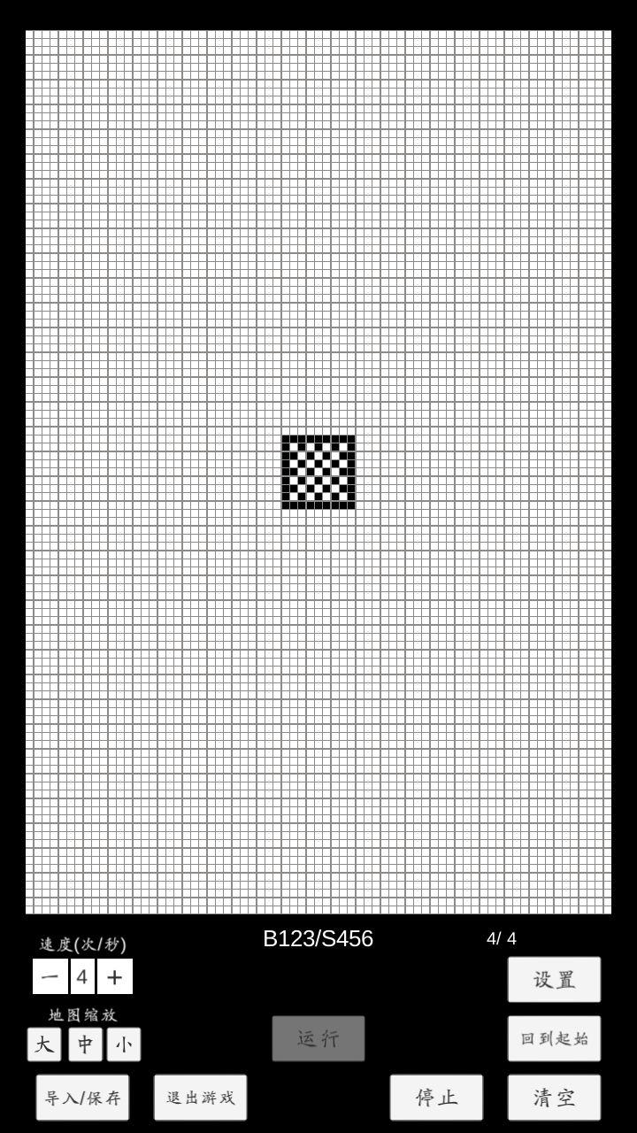当一个白格子周围八格内有3个及以上黑格子时会涂黑这个格子,代表了繁衍 当一个黑格子周围八格内有2个或3个黑格子时会保持原样不变,代表生存 当一个黑格子周围八格内有4个及以上黑格子时会涂白这个格子,代表挤占生存空间引起了死亡 当一个黑格子周围八格内有1个及以下黑格子时会涂白这个格子,代表种族大小不够生存引起了死亡