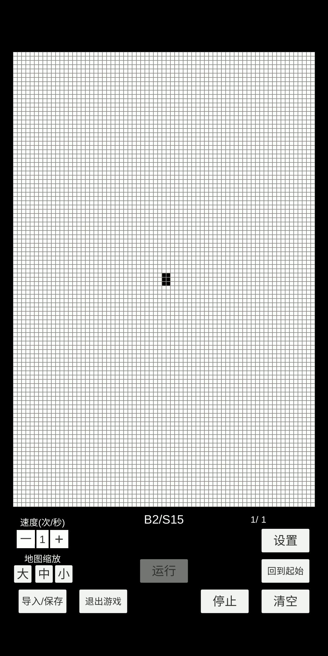 当一个白格子周围八格内有3个及以上黑格子时会涂黑这个格子,代表了繁衍 当一个黑格子周围八格内有2个或3个黑格子时会保持原样不变,代表生存 当一个黑格子周围八格内有4个及以上黑格子时会涂白这个格子,代表挤占生存空间引起了死亡 当一个黑格子周围八格内有1个及以下黑格子时会涂白这个格子,代表种族大小不够生存引起了死亡