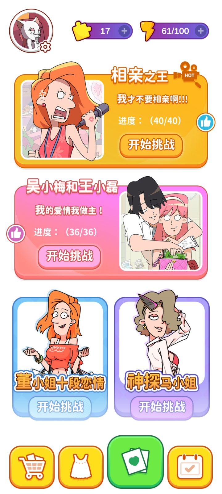 两个故事线都不算美好,没有后续就当做是开放式结局吧,也许马小帅会完成卧底任务,回到董小姐和孩子的身边,至于吴小梅和王小磊,他们俩已经站在对立面了,没可能了。拼图兑换的套装还有个手饰没得到,拼图不够了,剩下的服装也不想看广告了。