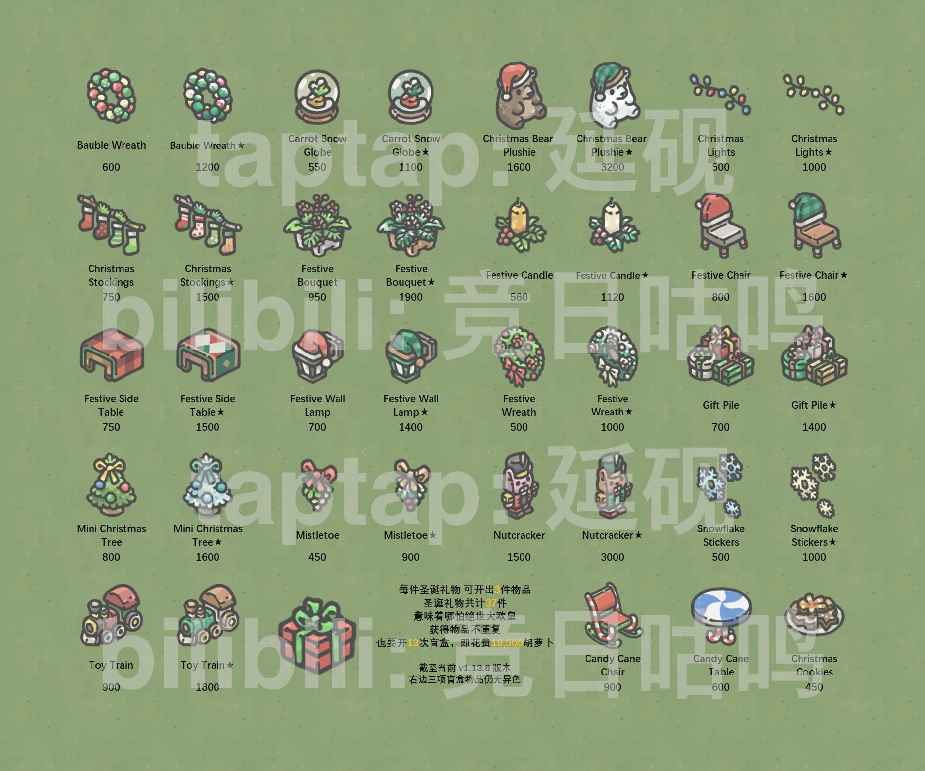 游戏需更新至1.13.8版本📆 活动时间:北京时间12月13日0800至12月29日0759📖 活动家具:图2图3图4。图3部分shiny家具,去年有买的玩家可提前用junker解锁🎮 活动玩法:图5🕯️ 图6:RIP鲁道夫✍️ 图7:又是一年写攻略。解决了画质问题,比去年出图更清晰🤪仅授权小某书作者 玩游戏的Y. 转载某4个数字的网站别偷我了