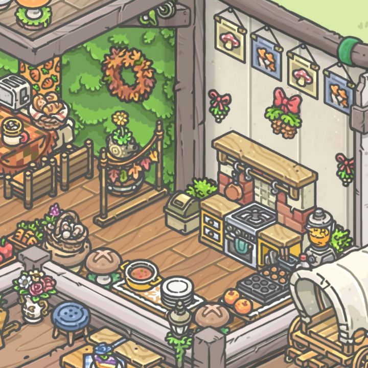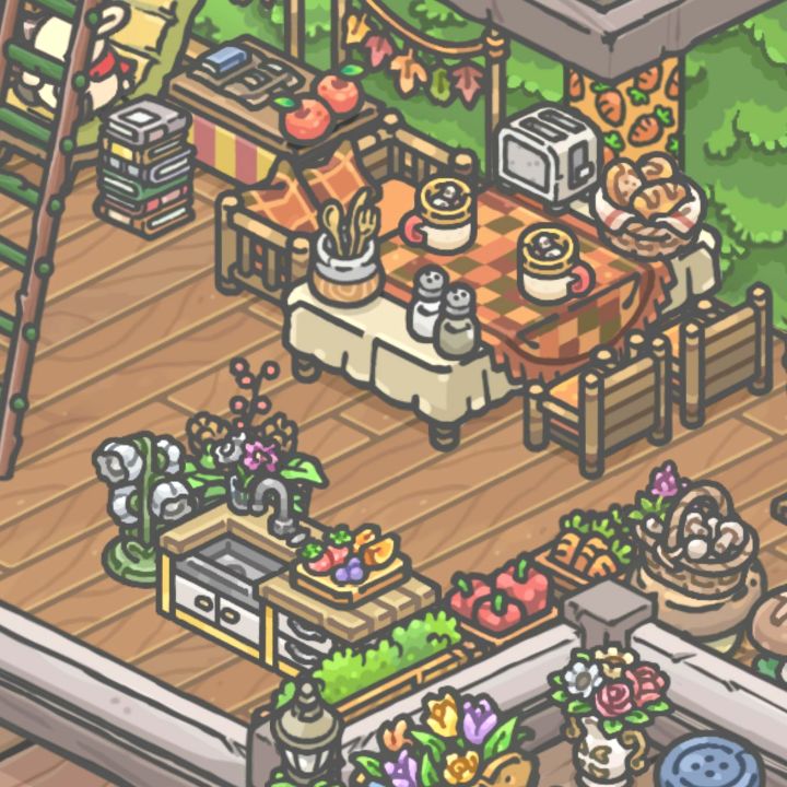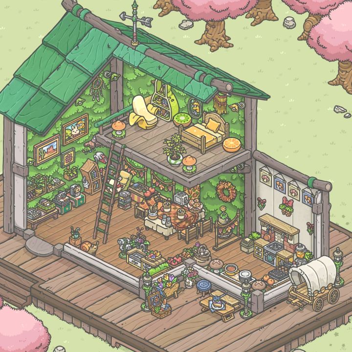 好喜欢这个[小厨房](虽然从未见过有人在这里做饭)有厨房当然就有漂亮的[饭厅]啦(还有洗手台,主打一个配置齐全物资充沛)给阿琪安排了[图书角](但都是月兔在坐)大窗户的[水果味卧室](阿琪待得最多的地方,很爱睡觉一个鹿)野餐一角[小小花园](可以在这里吃下午茶哦!)[马车](单纯地觉得它好看适合放这里哈哈哈哈#月兔漫游 )