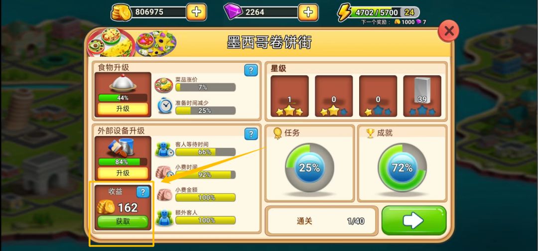 嘿,各位美食爱好者!在你们热衷于经营美食街的同时,不要忘记为你们的餐厅进行装饰,让它成为吸引人们瞩目的焦点! 在游戏的关卡界面中,你们会发现一个迷人的装饰选项,它就位于右下角。从这个入口,你们可以选择各种外部装饰,为餐厅打造出别具一格的风格。 通过巧妙的装饰升级,你们可以吸引更多的客人光顾餐厅,增加客人的等待时间,并提高他们的消费金额。这不仅有助于提高餐厅的知名度和收入,而且还让客人们享受到更优