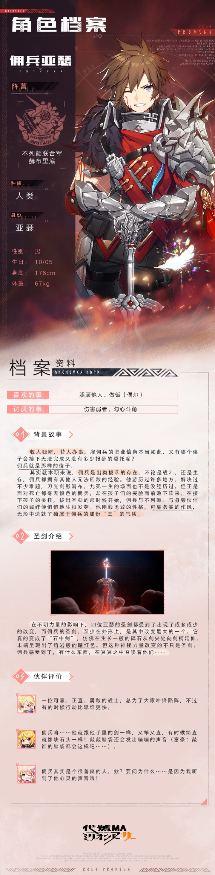 「这是一个讲述了100万人的亚瑟们,为了成为真王而战斗的故事。」从传说中溢出,从命运之轮里偏离。怀揣各自信念,误打误撞拔剑成为王的四位亚瑟,如今,即将再度启程前往新的大陆——✦佣兵亚瑟「上一次看到雪,是在什么时候呢?」由于无法拒绝小孩子的存钱罐和他们的哭脸,而接下委托内容为“打倒外敌”的善良佣兵,但完成委托需要借助王剑和骑士的力量,故而选择拔剑成为亚瑟王。在无数场拼上性命的战斗之后,佣兵
