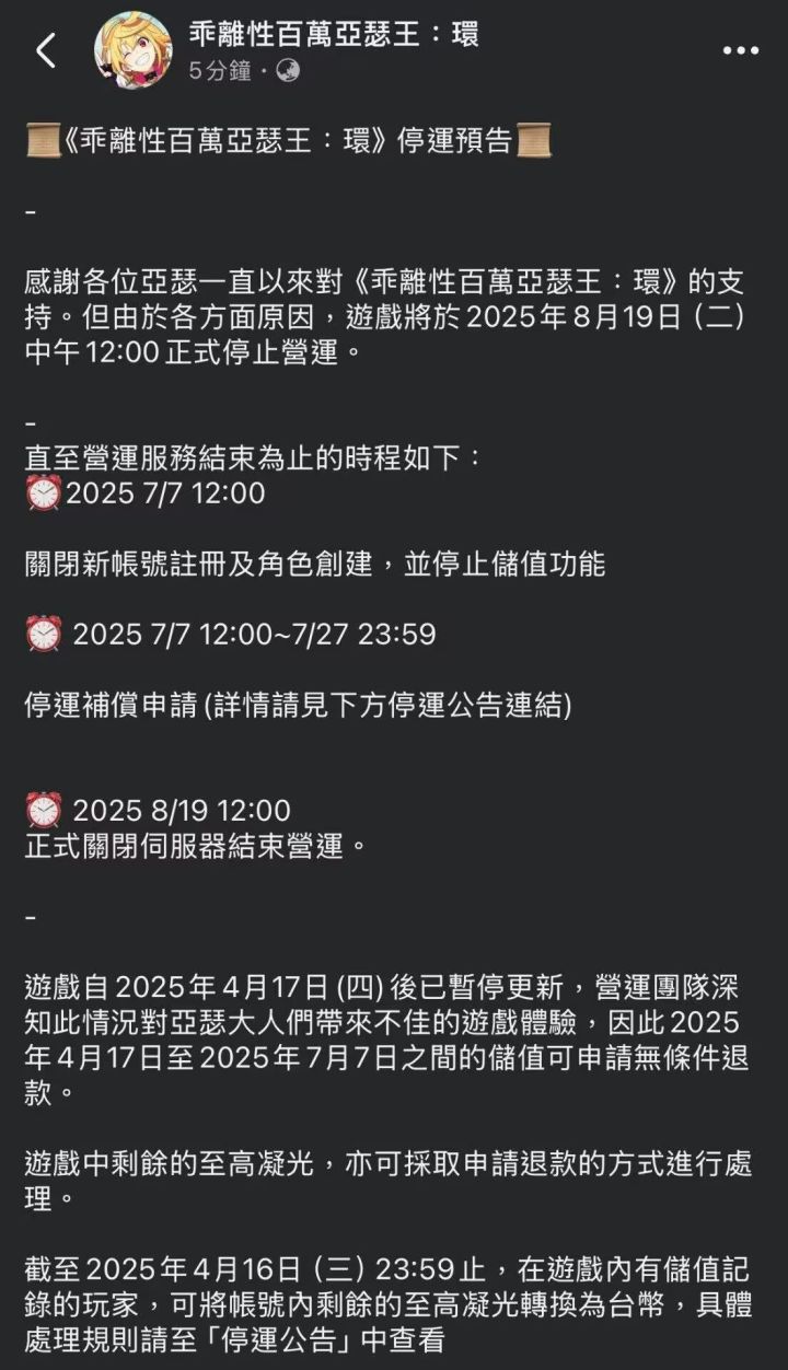 #今天游戏圈发生了啥 #资讯评论员 #乖离性百万亚瑟王环 #吃瓜爆料 #吃瓜群众 7月9日,《乖离性百万亚瑟王:环》台服官方宣布停服的消息,实在令人唏嘘。早在4月17日,游戏就因营收不佳等原因暂停更新,7月7日停止角色创建并关闭充值渠道,8月19日便要正式关服。 曾经的二游经典IP,如今却走向这般结局,在二次元游戏内卷的当下,创新是生存的关键。很显然,《乖离性百万亚瑟王:环》没能跟上节奏