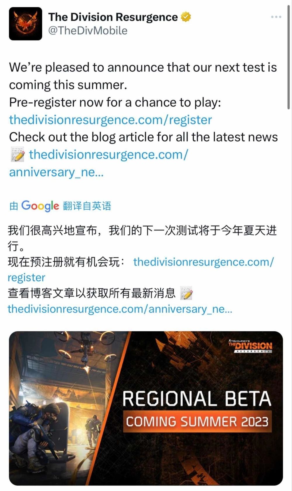 Ubisoft 预定 2023 年内在 iOS/Android 手机上推出的《汤姆克兰西:全境封锁》系列最新手机游戏《Division Resurgence 全境封锁:曙光》,于今天「Ubisoft Forward」中公开最新资讯,宣布将于今年秋天展开 beta 测试,并开放玩家立即注册;同时也将会把系列玩家们熟悉的「暗区」模式首次在手机上收录登场! (我整了韩国的地址了,大家拉到最下面有个🌎那可