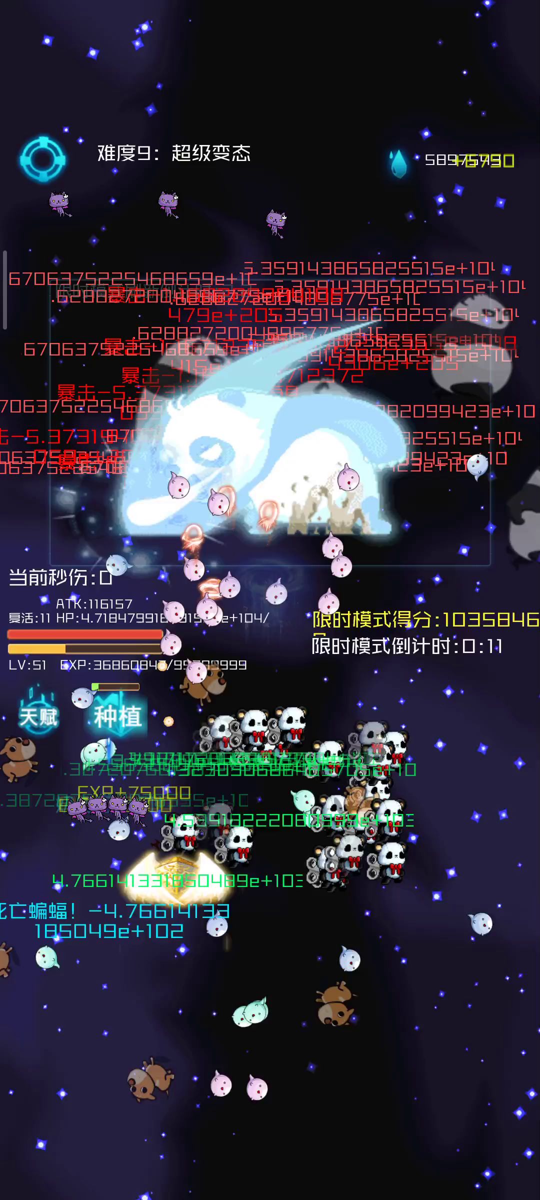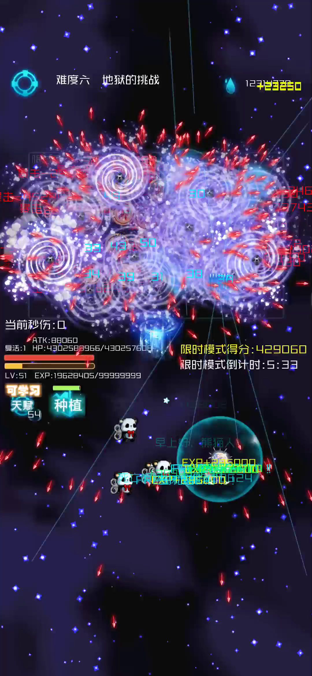 无限成长,不容反驳🙄 毕竟经验上限崩了,天赋≈∞,你想玩啥流派都可以,看我加点已经懒得选了,直接快速点完。这一批最显眼的几个特效一个是棋子,满屏红色子弹。一个是熊猫,密密麻麻的连自己在哪都看不见了。还有一个是猫,都蹦出一条线了😂