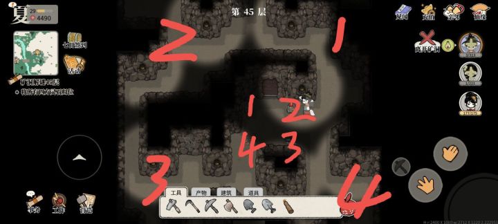 #矿洞解谜 解谜步骤图1为矿洞45层任务要求,图2图3为45层大致情形。图4所示,四角大数字为灵石初始所在位置,中间小数字为灵石所需要推到的位置,数字需对应且需按顺序进行(即大数字1所在的灵石要推到小数字1所在的位置,且需按顺序1234进行,因为灵石的位置存在不可破坏的障碍物,推好1的位置,2位置灵石处的障碍物会自动消失,2才可以推到相应位置,余下同理)。