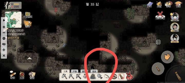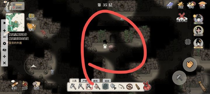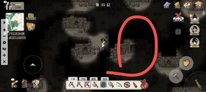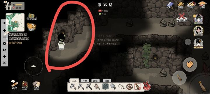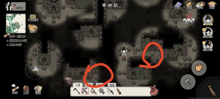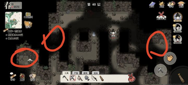 #矿洞解谜 一、解谜步骤图2图3所⭕示位置,即为图1任务中,2个石像的位置,使用镐子敲掉后即可完成40层解谜。注:这2个石像敲掉后各可获得一个珍宝,珍宝可以放在刘余的百宝阁中(放在对应的底座上),放置珍宝可以增加相应的美观度。二、目的及结果1、敲完2个石像后自动打开下层入口,入口位置位于图4所⭕的地方。!!!此处存在boss,推荐战力275以上(275约为可破防战力)。2、矿洞40层存