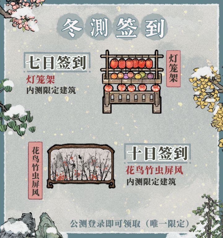 PS1:内测限定装饰品,大图来袭!七日签到送灯笼架;十日签到送花鸟虫竹屏风。公测阶段可免费领取哟~PS2:铜钱*5000 宝玉*199,今日冬测补助已发放~请大家签收
