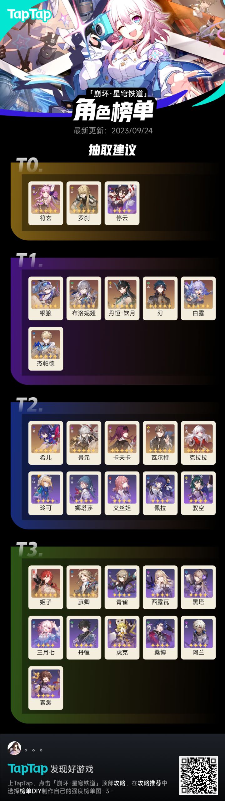 仅供参考T0:符玄:在各个领域都有很不错的表现(虽然她老人家身高不济,但能耐却是顶天的)优点:生存、辅助能力都很强,而且不吃战技点,基本可以单带一队缺点:不适合长线作战罗刹:使用率久居不下(如果你没有长着一张奥拓的脸该多好)优点:奶量极高、产点效率极高,自身还带有各种辅助功能,例如解控、解除地方增益效果等缺点:没有群体高回复停云:加攻充电宝,谁用都说好(停