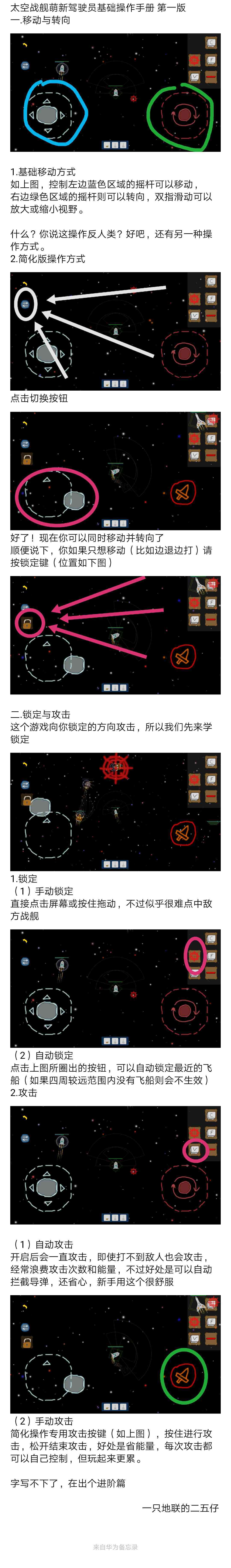 游戏有两种操作方式,两种操作方式可以适应不同类型的舰船,更新到0.1.1.5 C就可以体验到。 操作方式1: *自动瞄准:可以锁定离你最近的敌人 *自动攻击:使当前武器组的武器持续向接近是目标开火 *技能:释放舰船特有的技能 *护盾:如果护盾没有超载,自动展开护盾 *抓钩:可以抓住舰体或者矿石 小提示: -双指滑动可以放大或缩小视野 如果你有更好的关于操作的建议,可以在这里留言告诉我#独立游戏#游戏攻略