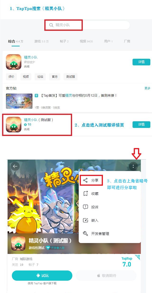 今日游戏开测,准备了一份小小的指南,通过精灵小队的基础QA,希望可以让您了解这是一个什么游戏,并且知道游戏中的一些小技巧,帮助大家玩的更加轻松和愉快!1、本次测试是否删档?本次测试为不删档测试,大家闲暇之余可以尽情体验!2、本次测试包含ios吗?ios的小伙伴非常抱歉,本次测试暂时不包括ios~3、怎样下载游戏?在TapTap首页直接搜索《精灵小队》游戏名,进入到测试服详情页,点击【试