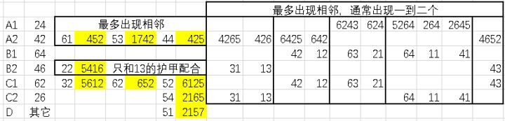 星图看上去是个图,但是稍微有点数学知识的人都知道,它实际上是个1-7七个数字的顺序排列组合(也就是7!个组合)。但是作者肯定不会傻到写5040个代码组合,并给他们一个个设定输出结果,所以肯定有某种偷懒的办法,那么办法是什么呢?答案就是,检测其中的某些字段,然后对应字段输出对应的加成buff!猜到作者这个偷懒办法之后楼主就开始着手破解——先统计出所有的buff,然后制表,最后开始漫长的测试——从2个字符,到3个,最后到4个(5个往上顺序字段是几乎不可能的,作者不会说设计某一个buff要连续对5个数才能触发,这很不符合程序员偷懒心理,因为让我来设计就会2-3个顺序字段触发简单的buff,加一位触发稀有buff)统计和一次次画图花掉了楼主大约5小时时间,最后证明楼主猜对了(老东西你的心思全被我猜到啦!)