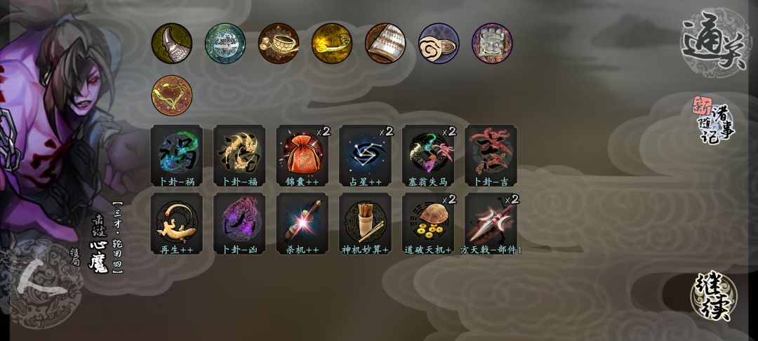 长命锁想着保一手,结果没用上。最好打的boss是善待巫阳,她不会打你。 本来我是玩八卦的,后来难度上来后我发现可以精简不少我的卡组。 核心卡是至少3张完整梨花针(造成n次n点手牌数的伤害),加至少两张的卜卦凶(越多伤害越高,但要注意反伤)。护符拿加保留牌的,另外桃花簪(随机一张保留牌多触发一次)看到也尽量拿,上古桃枝(凶和祸不再对自己造成伤害)看到必拿,没有也没关系。再次拿加摸牌的。 其余牌基本是