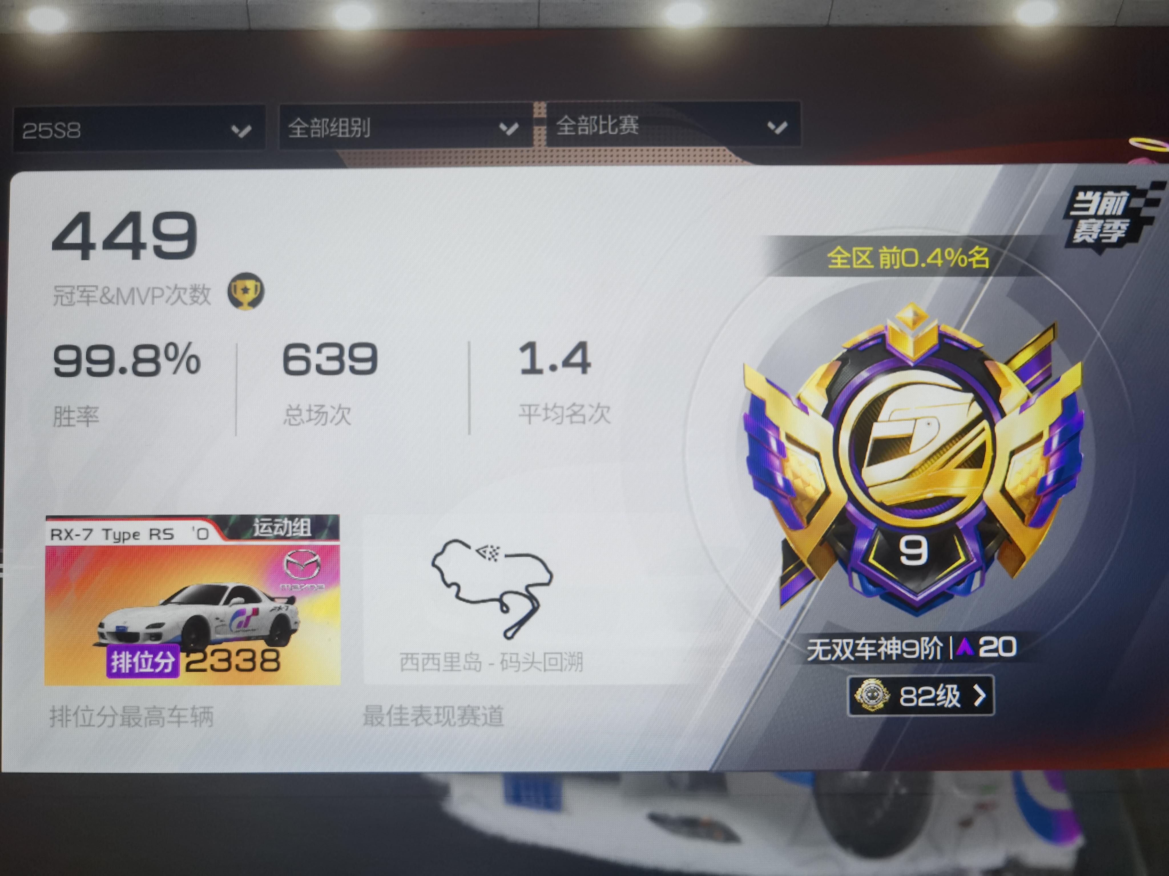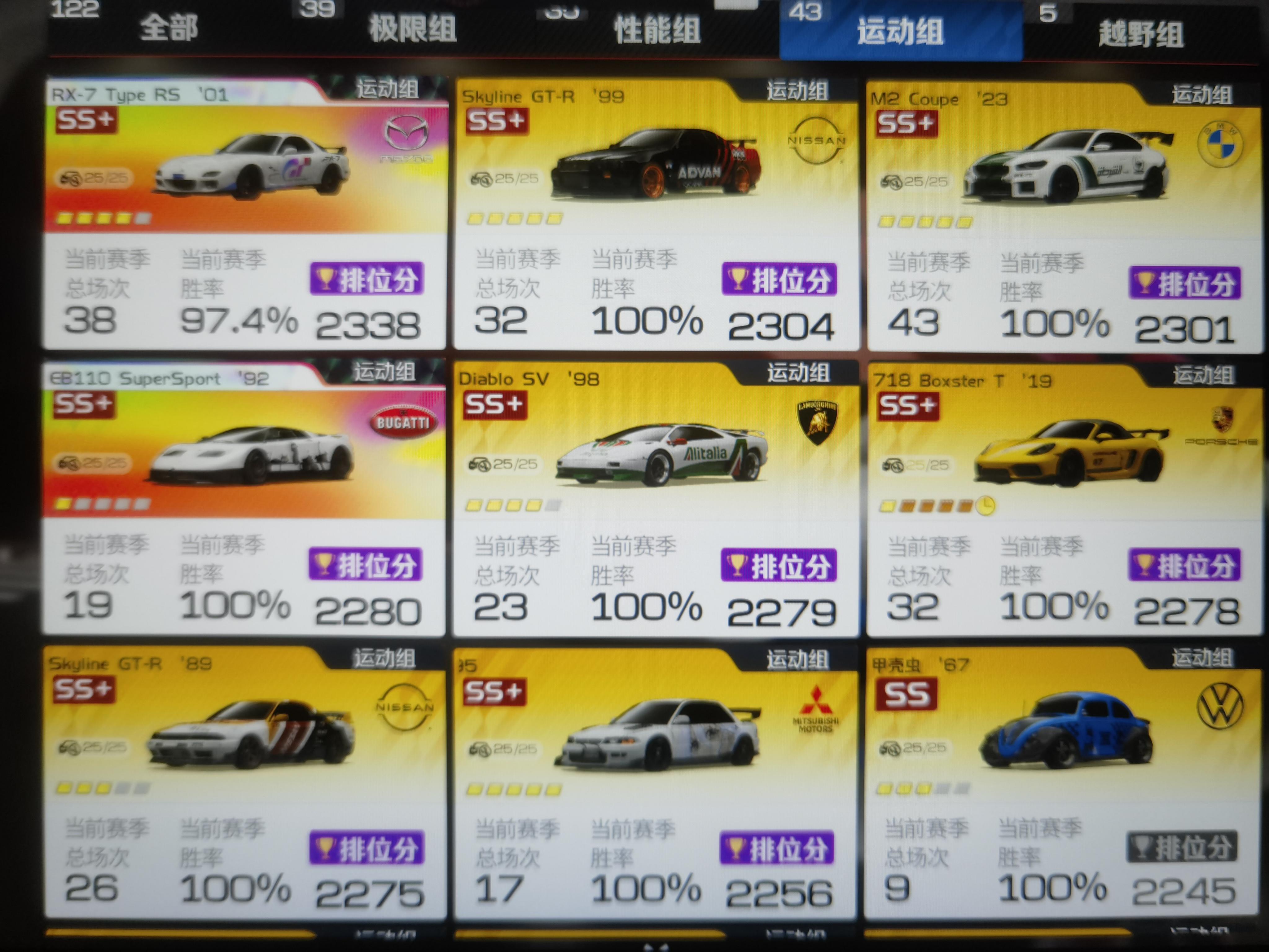 然后是排位赛。排位赛还很良心,每天会给你3次保护排位分的机会,所以完全不用担心掉分,我玩了才两个月就已经有一辆车排位分打到2122分了,好像是运动组的布加迪EB110二阶满改。希望刚入坑的朋友们也能快速上手。