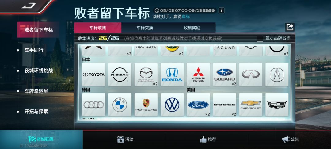 精彩湾岸赛道,要么战!要么和! 败者留下车标,好友交换车标 小极最近也在参与【败者留下车标】的活动 为了我的本田信仰Type-R而努力😎 接下来小极给车手们介绍一下集换指引吧 (各位大佬行行好,跟小极交换一下车标吧) 车标收集 车手可参与排位在湾岸赛道中大显身手 战胜指定对手即可收集他们的车标 车手们每天最多有五次机会赢夺别人的荣耀标志哦~ 玩家点击【败者留下车标】 即可进入车标收集界面 可以在【