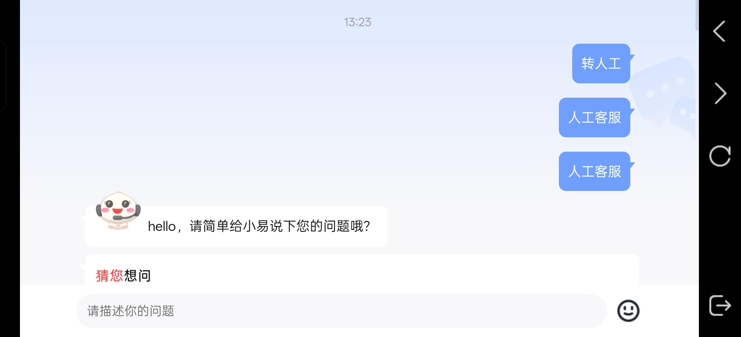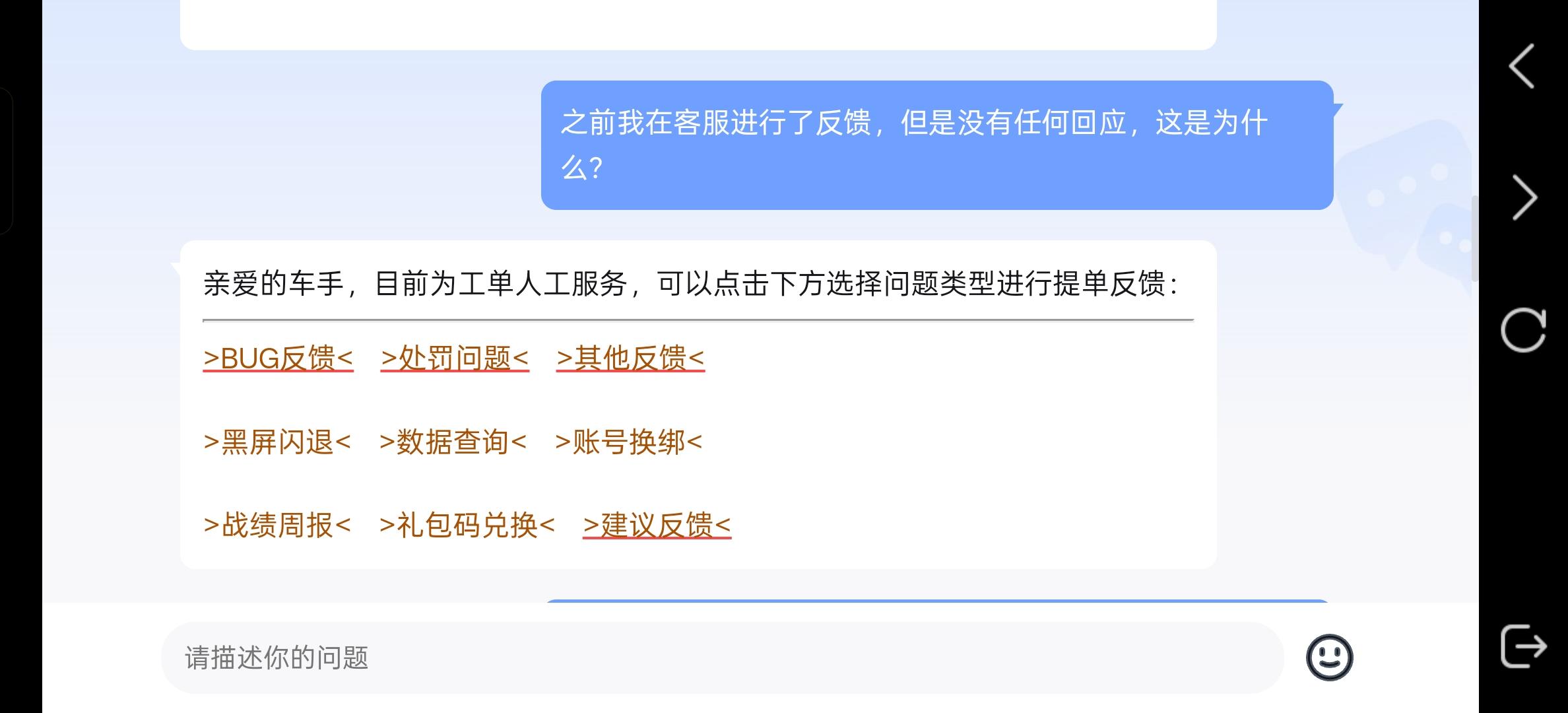 真的,我现在一肚子火,你们那个破AI客服能不能给他踢掉啊?网易这么大的一个公司,雇不起人工客服吗?反馈问题天天对牛弹琴,问完问题之后,只会让我提交工单反馈,但是提交工单之后,没有任何的回应,没有任何的查实进度,处理进度,问AI就想让我重新提交反馈,问题是这玩意真的有用吗?你自己看看这视角都扭到哪去了?一个赛车游戏,我看不到路的?我现在在玩什么啊?