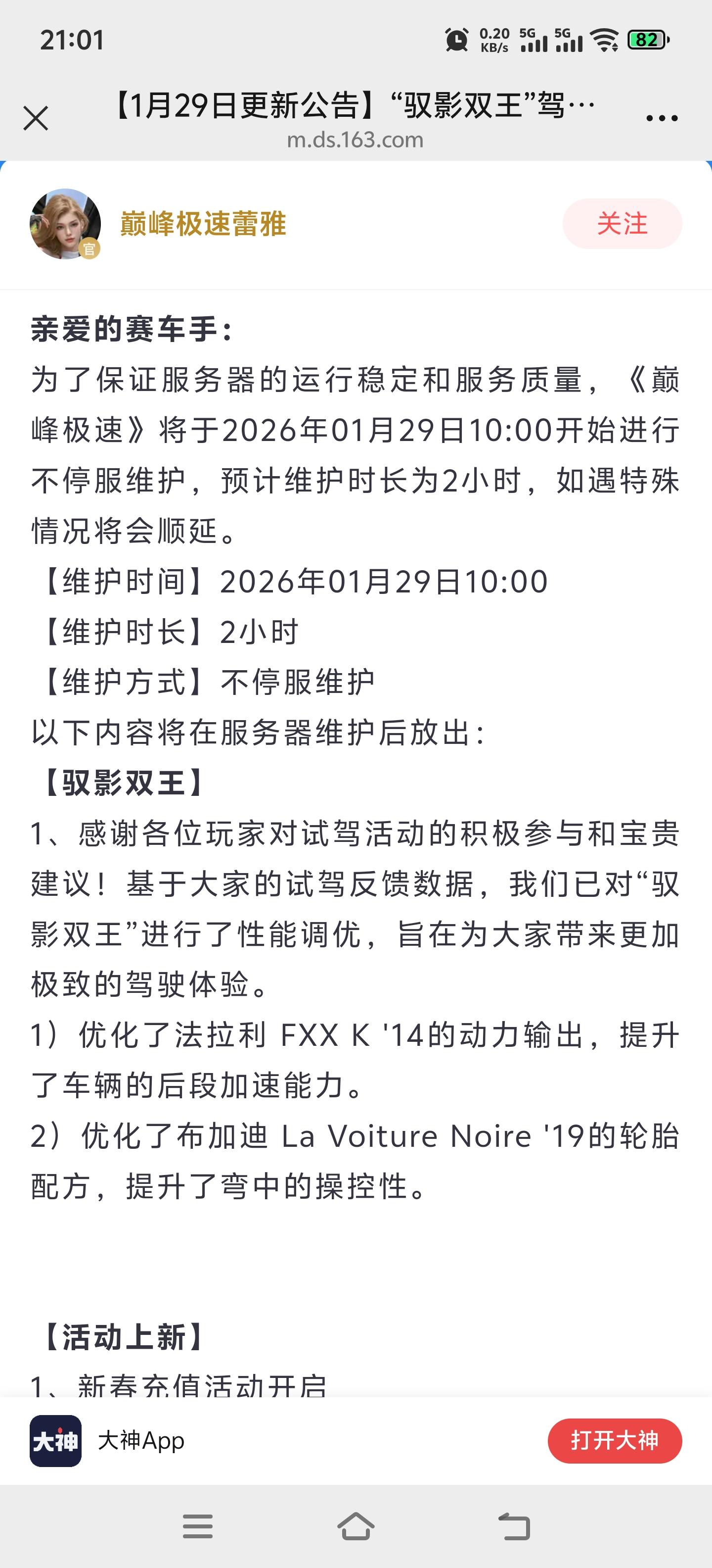 亲爱的赛车手:为了保证服务器的运行稳定和服务质量,《巅峰极速》将于2026年01月29日10:00开始进行不停服维护,预计维护时长为2小时,如遇特殊情况将会顺延。【维护时间】2026年01月29日10:00【维护时长】2小时【维护方式】不停服维护以下内容将在服务器维护后放出:【驭影双王】1、感谢各位玩家对试驾活动的积极参与和宝贵建议!基于大家的试驾反馈数据,我们已对“驭影双王”进行了