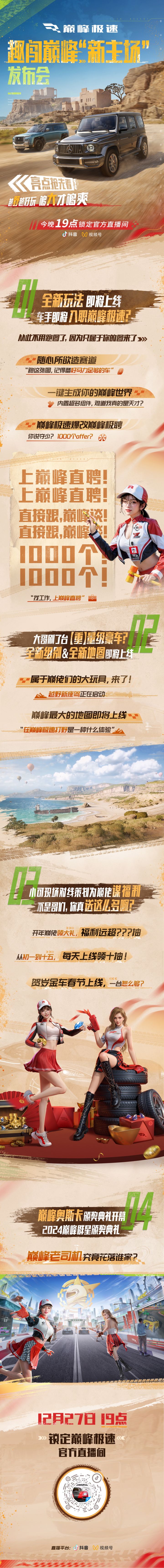 爆料不断,福利加码💰!发布会直播倒计时2天!准备好迎接巅峰新主场的福利风暴了吗?福利远不止“???”抽!锁定12月27日晚19点——巅峰极速发布会趣闯巅峰新主场,小可带你揭秘更多惊喜,让你的心跳加速,新春福利领到手软🎁!还有“前所未有的创意趣味玩法”也将首次曝光!我们到时不见不散~和小可一起驶向2025,开启赛车乐园的新篇章✨!#巅峰极速