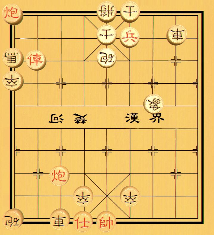 精巧小杀局,原谱红连照胜,正确。本局红方第2回合与黑方“花心”献兵很巧,这种战术在古谱中多次出现,尤其是献车更为多见,也显得更为精妙。着法:红先胜1.车八进二 / 士5退42.兵四平五 / 士6进53.车八退九 / 马1退24.炮七进七红胜(原谱着法)