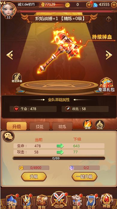功能介绍:1、神器是征战第二关的时候开启,开启后通过完成神器任务来激活解锁,解锁神器后能提升战斗力和英雄属性。2、神器一共有5把,每把神器都有它的解锁任务,神器解锁后能在布阵界面装配上阵,战斗中每3个回合会发动一次神器技能来攻击对手。3、神器也能升级和精炼,还有技能效果,等级越高,属性加成和战斗伤害也就越高,但需要5把神器都解锁后才能养成。4、神器的附加功能:铸魂,铸魂的等级越高,加成的属