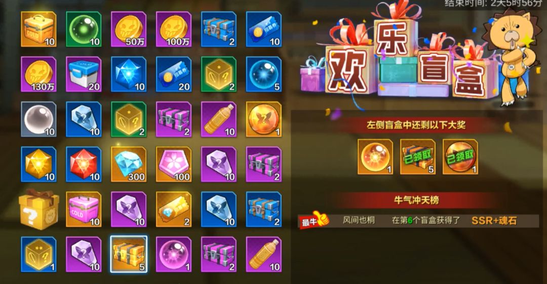 限时活动欢乐盲盒开启后,死神代理们可以通过花费钻石来开启盲合。盲盒池中共有36个盲盒子,每次盲盒抽奖最低仅消耗200钻石即可。在勾选盲合自动付费后,每次点击盲盒会自动扣除钻石。开启盲盒后有概率获得钻石、连携宝箱、武器碎片宝箱、灵珠、魂石等多种类高价值道具。如哪位死神代理在10回合内抽得终极大奖SSR+魂石,可以说是尸魂界超欧皇的存在。 各位死神代理登录游戏后,如发现开放了限时欢乐盲合活动,不妨抽上10发来试一试当前运势。