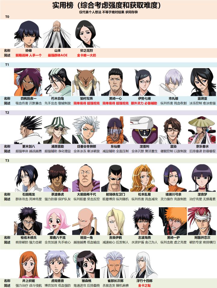 1死神IP,大爱蓝染,市丸银。2前期资源主堆方向,金卡涅茧利,紫卡八千流,蓝卡吉良,绿卡小七绪。3低氪阵容:涅茧利>八千流>银=碎蜂>一护,最后一个位置看碎片概率中氪阵容:上面5个+朽木白哉(慢慢氪,人民币战士)土豪阵容:涅茧利(群毒复活)+八千流(提速加灵)+4星牙密(降速)+卯之花烈(驱散debuff)+4星白一护(秒前排)+朽木白哉(秒后排)(武器升星,技能觉醒,氪金无底洞)4额