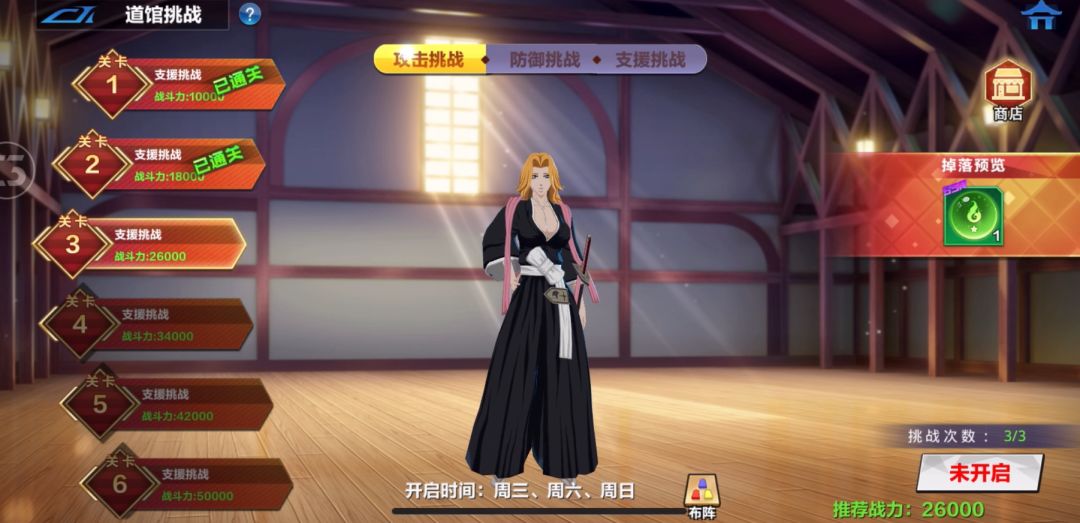 各位死神代理!在不断让自己变强的同时,不要忘记每日与我们一起战斗的伙伴“斩魄刀“。当自身变得更加强时,我们斩魄刀也是需要得到充分的提升。”道馆挑战“就是这样一个为斩魄刀提升实力的活动副本。 道馆挑战类型分为三类:“攻击挑战“、”防御挑战“、”支援挑战“。只有对应属性的角色才可以进行对应道馆的挑战。每周一至周六会开放一个道馆,周日所有的道馆均会开放。挑战道馆成功后会掉落物品升星的关键道具“灵珠”。如获得的灵珠等级较低火或并不是我们需要的属性,也可以对灵珠进行分解获得“道馆挑战奖章”,通过奖章兑换需要的灵珠。 当死神代理想对自己的斩魄刀提升实力时,可以来道馆进行挑战。